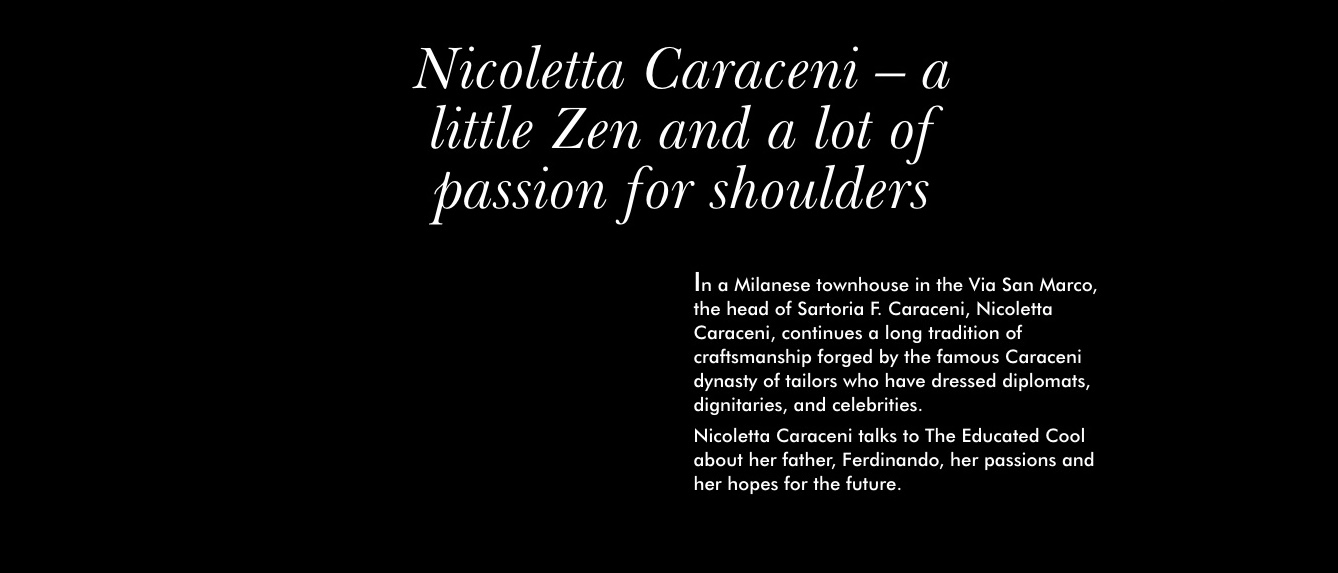 This ‘digital magazine for cosmopolitan minds’ features fashion, art, design, politics, music and much more. My interview with master craftswoman Nicoletta Caraceni offered a great insight into her passion for bespoke tailoring. She was thrilled with the article.